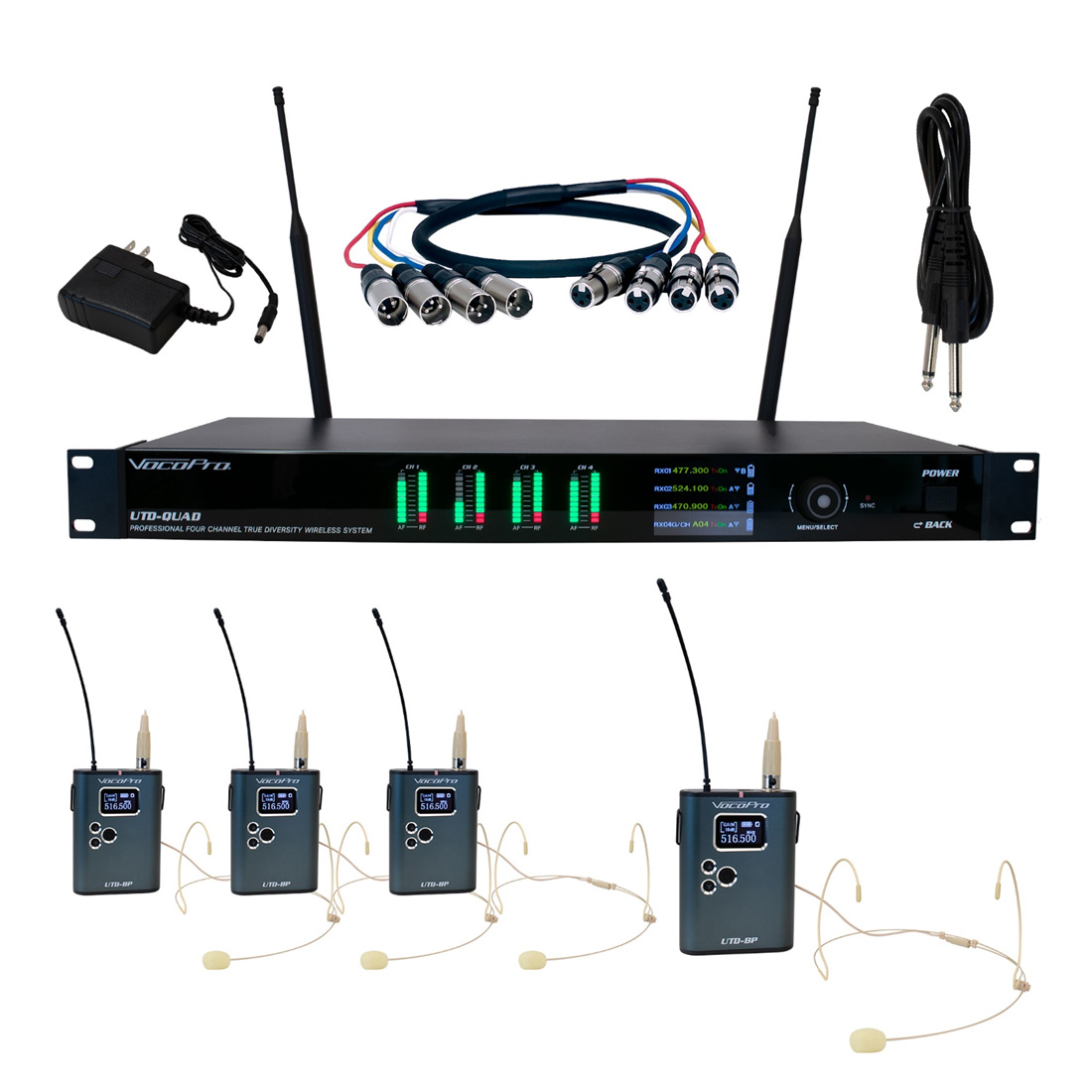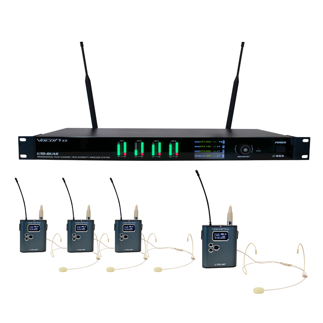 Quad True-Diversity Professional Digital Wireless PLL Microphone System with Four Bodypack Transmitters and Low-Profile Beige Headset Microphone