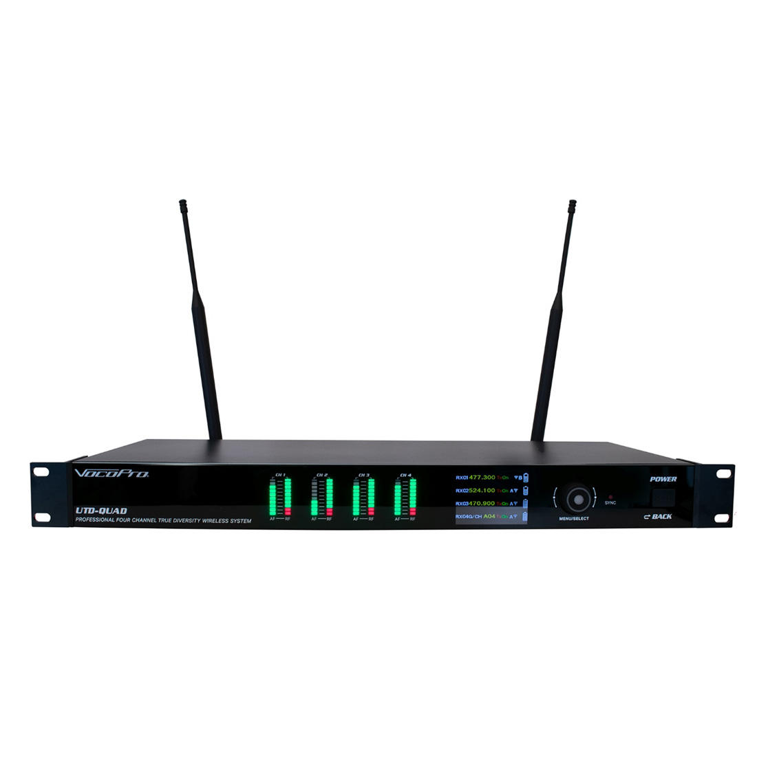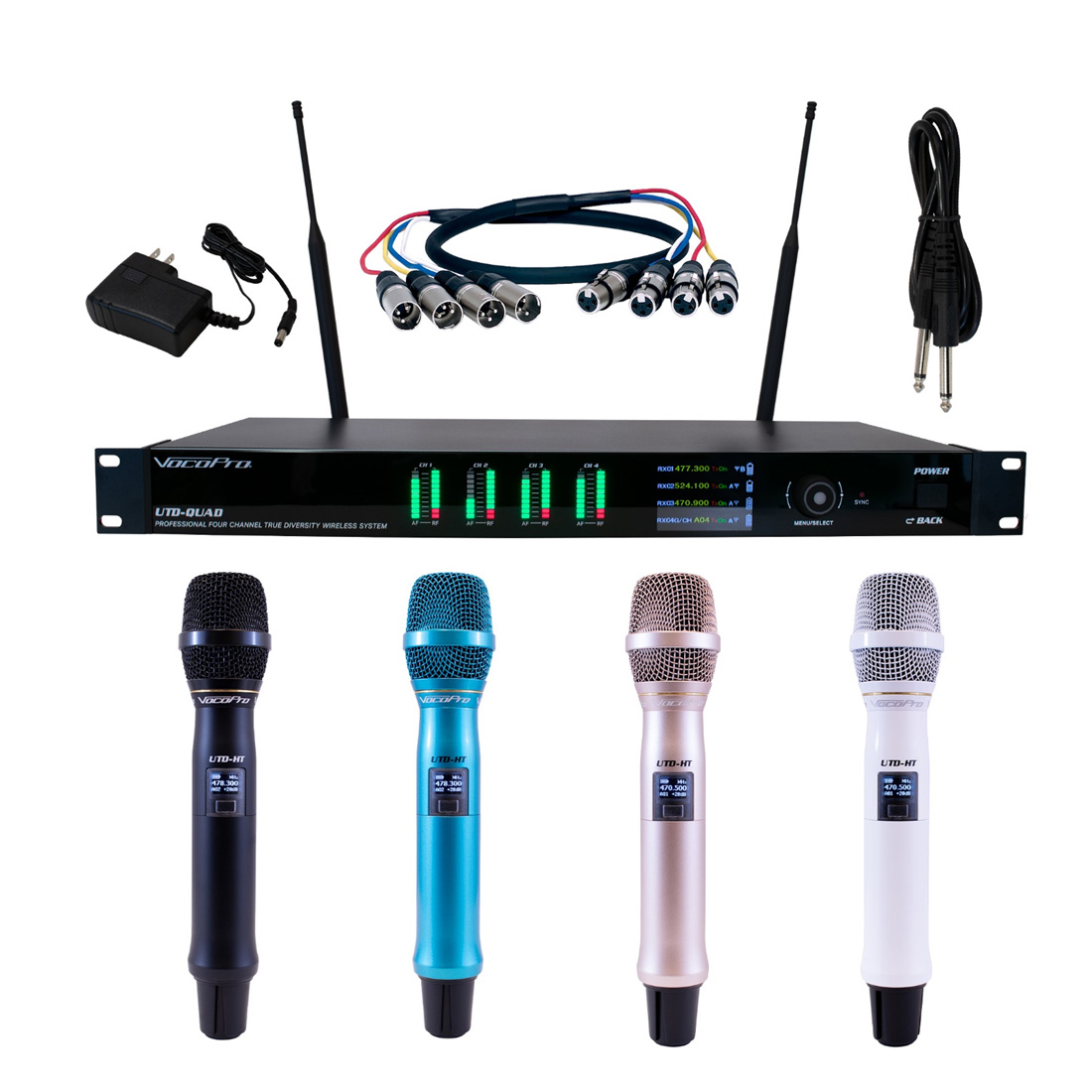 The VocoPro UTD-QUAD is a state-of-the-art true diversity wireless microphone system designed for superior performance in demanding environments such as large venues and locations with heavy RF traffic. With two independent receivers for each microphone transmitter, the UTD-QUAD delivers reliable, dropout-resistant reception, making it ideal for critical live sound applications.