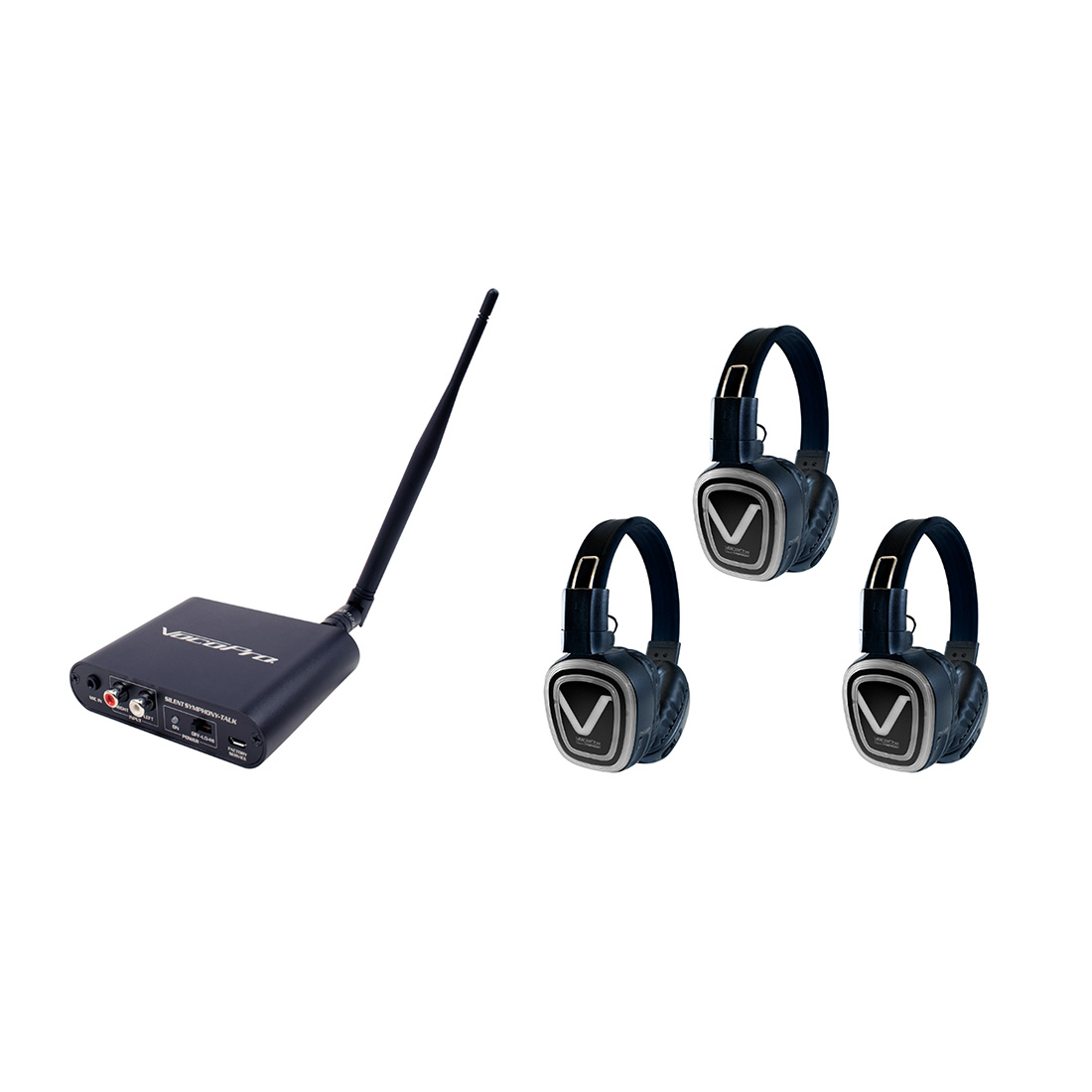 Professional Long-Range Silent Disco/ Event package with One Transmitter and Three Headphone Receivers