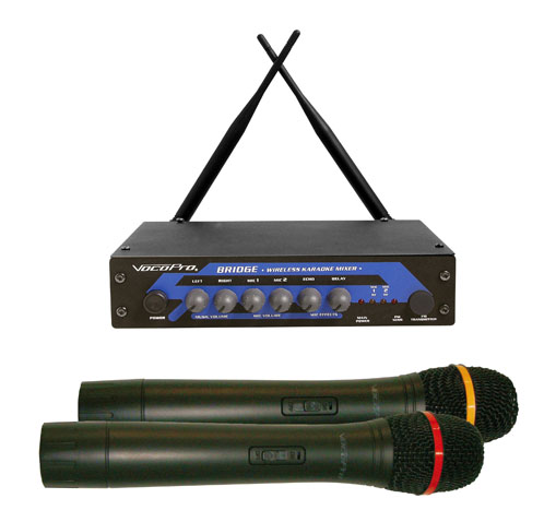 The BRIDGE is the latest in portable vocal technology. With 2 wireless microphones, stereo RCA inputs, 1/8" audio input and an FM transmitter, it allows you to sing along to your favorite discs or Mp3s in the car or bus for hours of on-the-road fun. It also has a 1/8" audio input to connect your portable DVD Player, iPod, Laptop, or other audio device, for a total Mobile Vocal Experience.