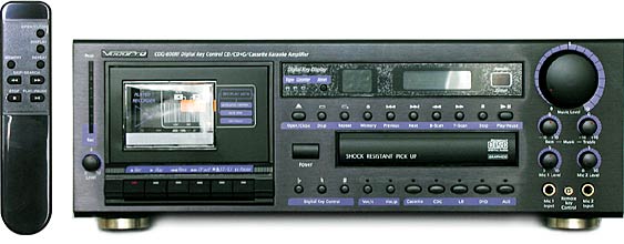The CDG-600RF is very similar to our already popular CDG-500RF with one major difference.... a built-in 250W power amplifier. Owners of the CDG-600RF simply have to connect speakers and microphones to have a full-fledged Vocal system. With an added cassette deck you can play and record your own demo tapes with ease. We have even included a Record Level Control for the cassette deck complete with an LED meter display. The CDG-600RF has Vocal features such as a 19-step Digital Key Controller, Digital Echo, Vocal Cancel and Partner features to remove guide vocals from multiplexed vocal tracks. There are 2 microphone inputs with individual volume controls, allowing singers to perform great sounding duos together! A third DJ microphone input is echo bypassed since most DJs prefer dry output for making announcements. Three audio and two video inputs allow DVD, VCD and LaserDisc players to be connected. VocoPro's CDG-600RF is a wise investment for anyone ready for quality Vocal entertainment!