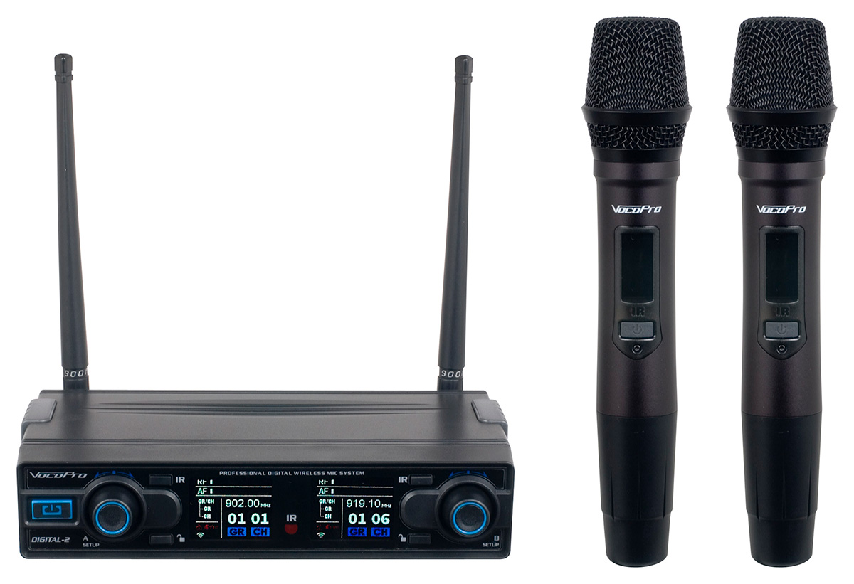 A daring duo! The DIGITAL-2H by VocoPro is both a competitor in technology and champion of value. Lending its crystal clear audio quality to exclusive mic-on-chip technology, the DIGITAL-2H remains triumphant where others fall short. Far removed from Wifi networks and Television Broadcasting transmission frequencies, this dual channel wireless system is a practically flawless addition to any performance rig. The DIGITAL-2H receiver has a high-resolution color LCD display showing crucial information such as radio and audio signal strength, group & channel, and even microphone battery status. A built-in frequency spectrum analyzer with a graphic readout will provide an idea of the RF environment you're performing at, allowing you to avoid any potential problems when selecting frequencies. Its dual diversity antenna will ensure the best signal reception even in heavy RF traffic.