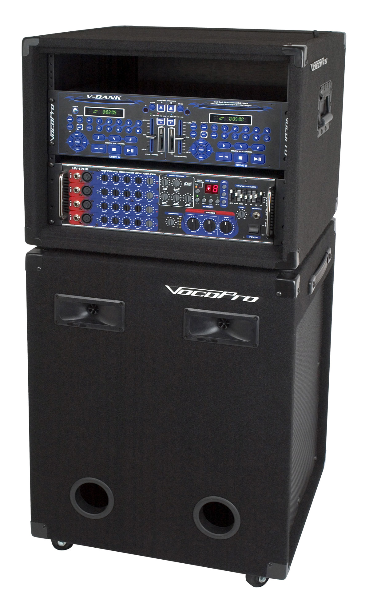 The PRO-ENTERTAINER is a 1200W audio powerhouse. It combines VocoPro's latest pro level units; the V-BANK and HV-1200, in a mobile four speaker stereo platform.