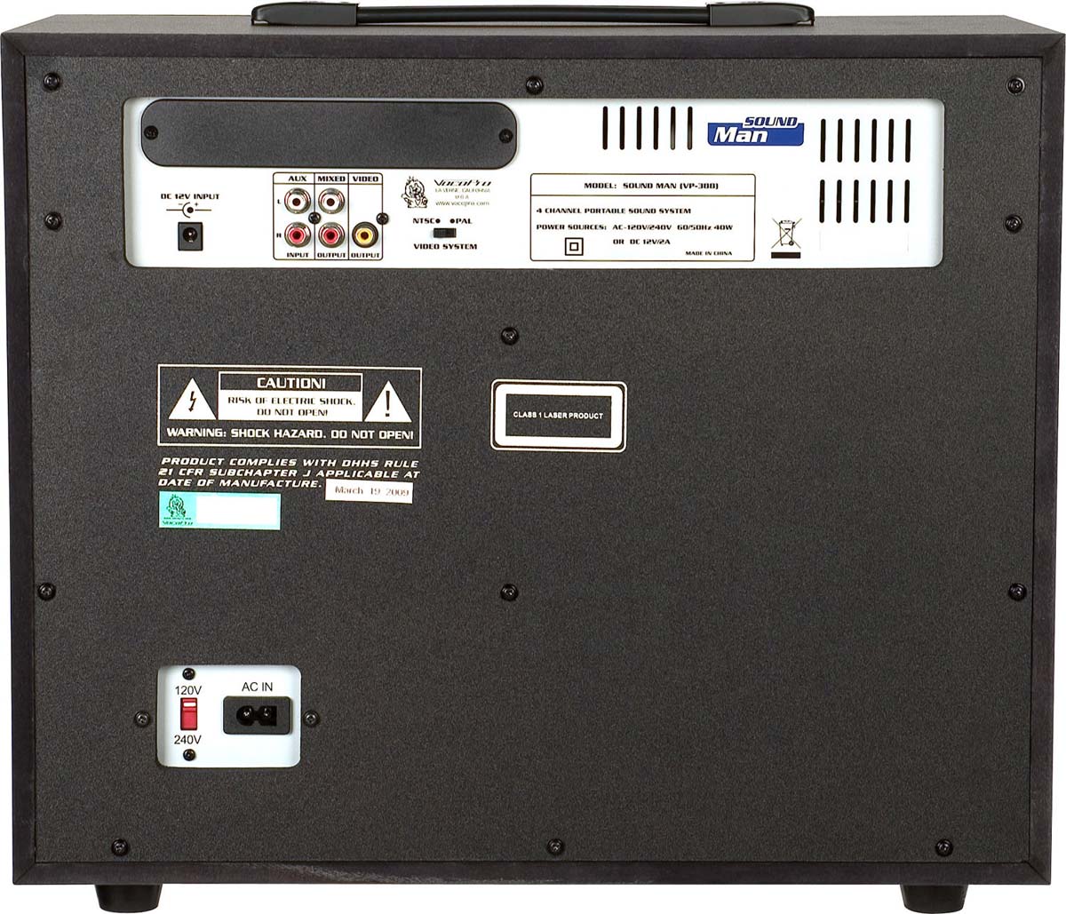 The SOUNDMAN combines a disc player and mixer with a high quality speaker cabinet. Its stereo outputs allow you to connect your external speakers or recording system.