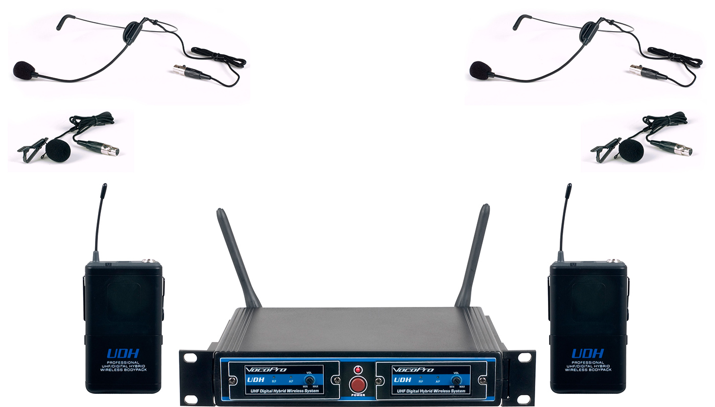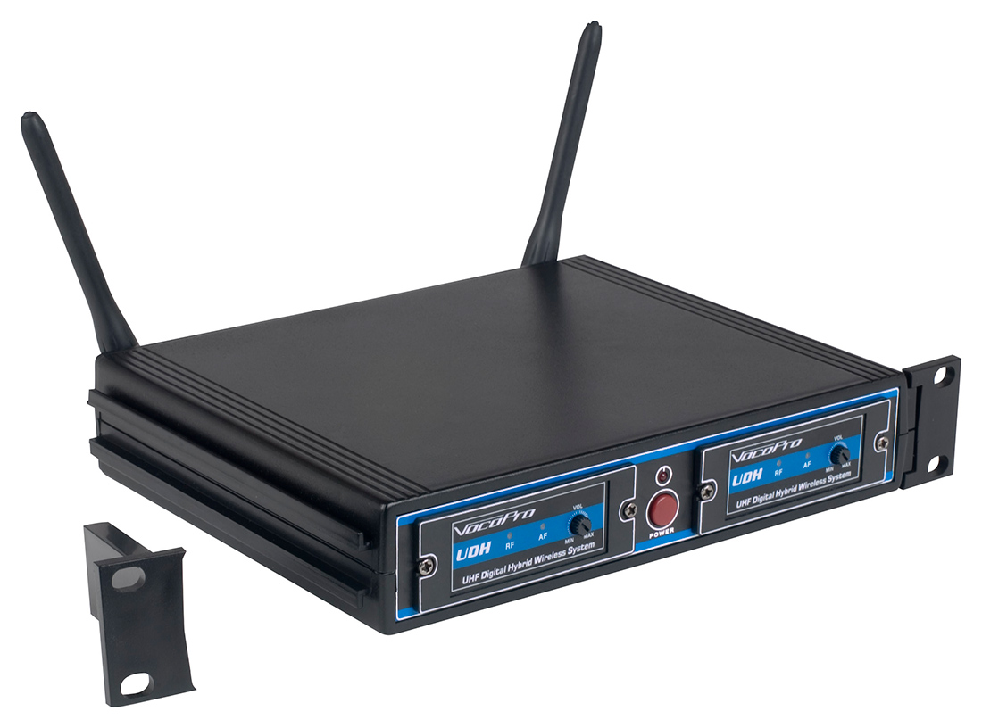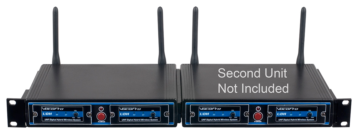 Vocopro is proud to introduce a brand new way to bring reliable wireless microphones to the masses: a UHF/DSP hybrid system. A Hybrid system can take advantage of both digital signal processing and analog UHF transmission. Having a DSP chip to process the audio not only replaces hundreds of components to increase reliability but also reduces cost and background system noise. The vocal signal is then communicated by our proven UHF technology; making the UDH-Dual a revolution in both performance and value.