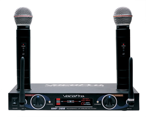 This dual wireless microphone system operates on the clearer UHF band, giving you crisp sounding vocals. The on-board chargers conveniently allow you to charge your mics whenever you aren't singing. Extra convenient for home use plus a great sound for public performance.