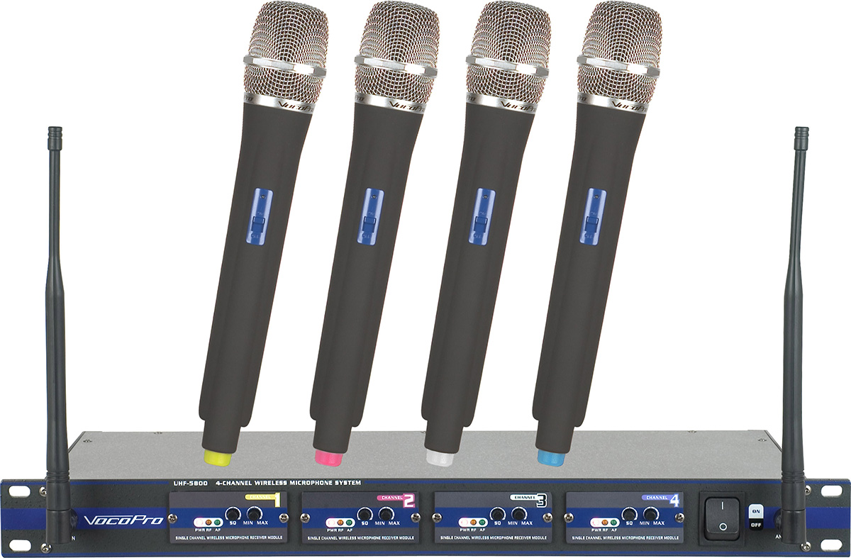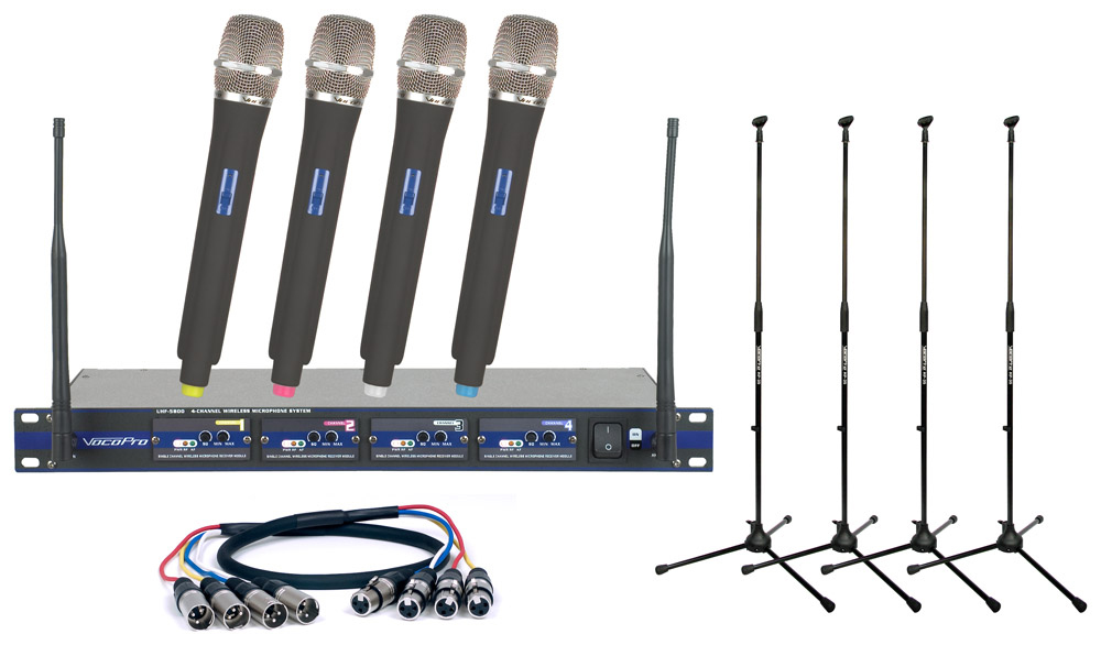 Cut the cords and free up your performances with VocoPro's latest microphone package: the UHF-5800-MC! This complete microphone system comes well equipped with 4 handheld microphones, 4 professional microphone stands, a rugged 1RU metal-chassis receiver, and 1 XLR-Quad cable. The 4 handheld mics each transmit on a unique frequency, minimizing the chance of crosstalk. Every microphone also has a dedicated XLR output allowing for discrete mixing, enabling the XLR-Quad cable to patch in all 4 microphone signals with just a single cable. The included microphone stands make the UHF-5800-MC the perfect microphone system for choirs, school productions, or vocal groups looking to cut cables without spending a fortune.