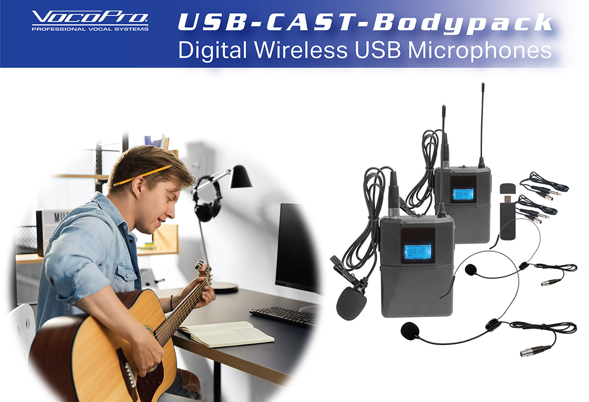 The USB-CAST is available with conference mics, handheld mics, or body pack system with lavaliere and headset mics and instrument cable.