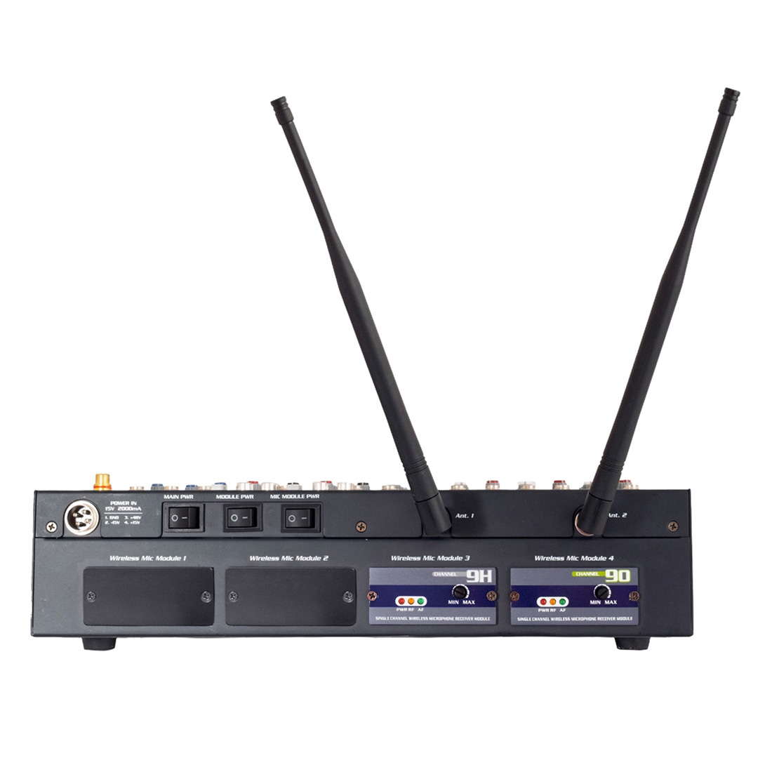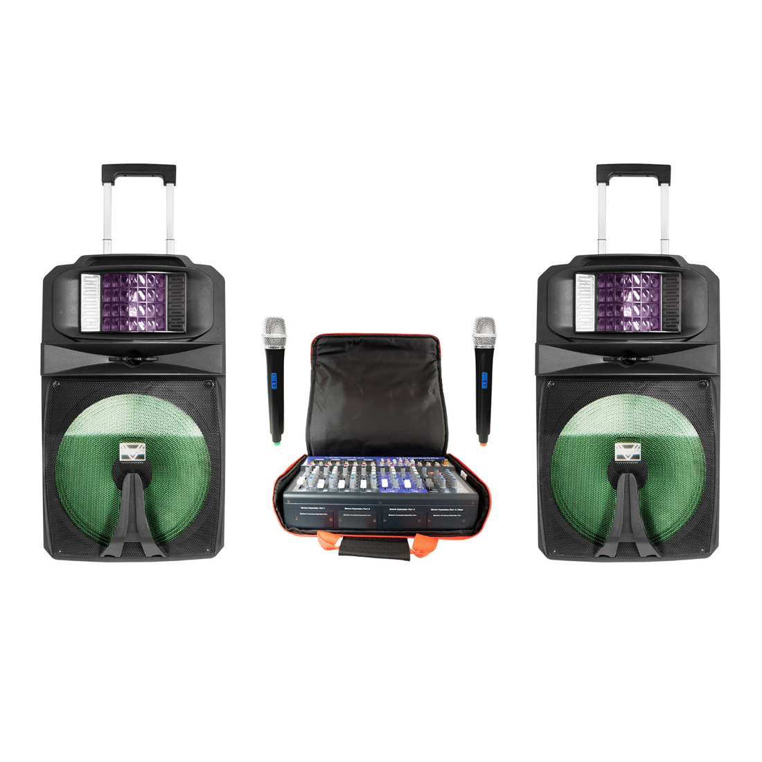 2000W PA system with two digital wireless vocal microphones, eight channel mixer with DSP vocal effect and two 15-inch powered speakers with build-in derby light.