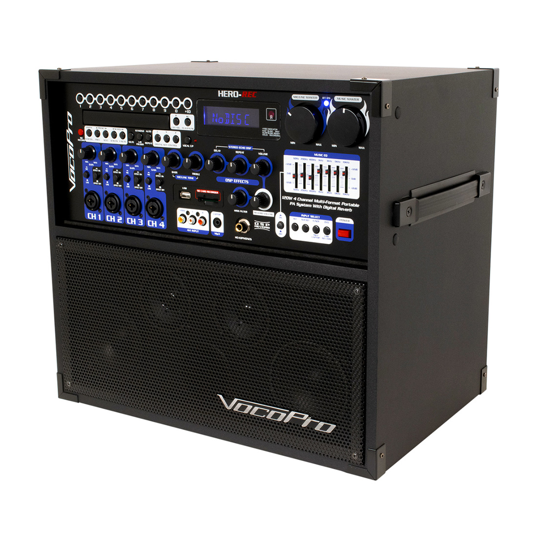 The HERO-REC-BT professional sound system is a powerful 120W 4-speaker stereo system that hosts pro-level features such as a 4-channel mic/line mixer, SD card recorder, DSP reverb & hiss filter.