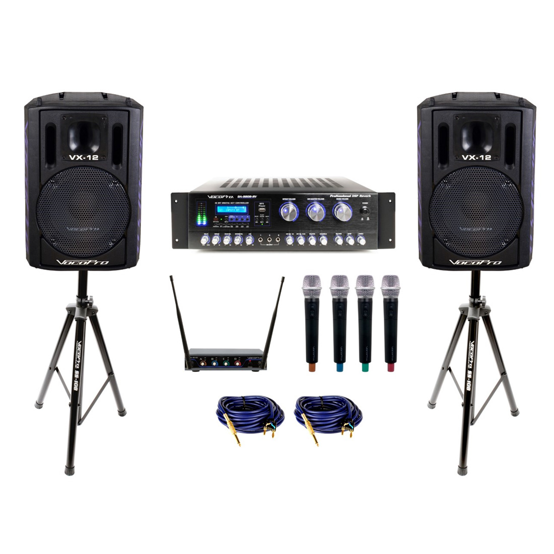 System includes a professional 600-Watt DSP karaoke amplifier, a pair of 12-inch professional vocal speakers on stands, plus a four-user wireless microphone system with handheld mics.