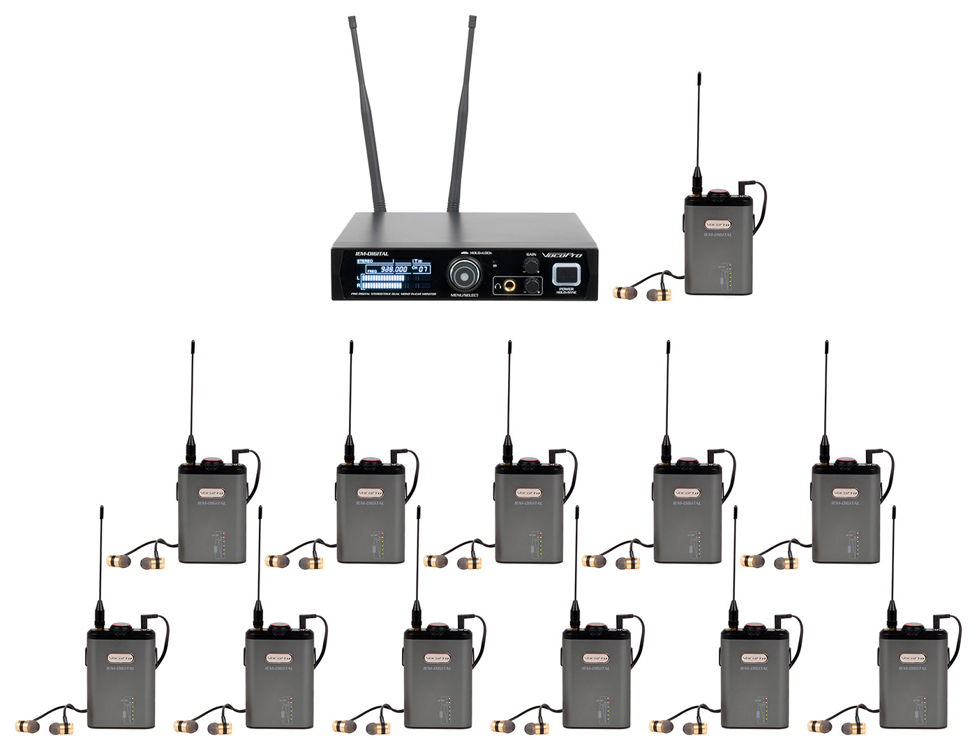 VocoPro's IEM-DIGITAL uses two separate digital frequencies to send out stereo/dual mono signal to each stereo body pack receiver, providing the user with a true stereo experience.