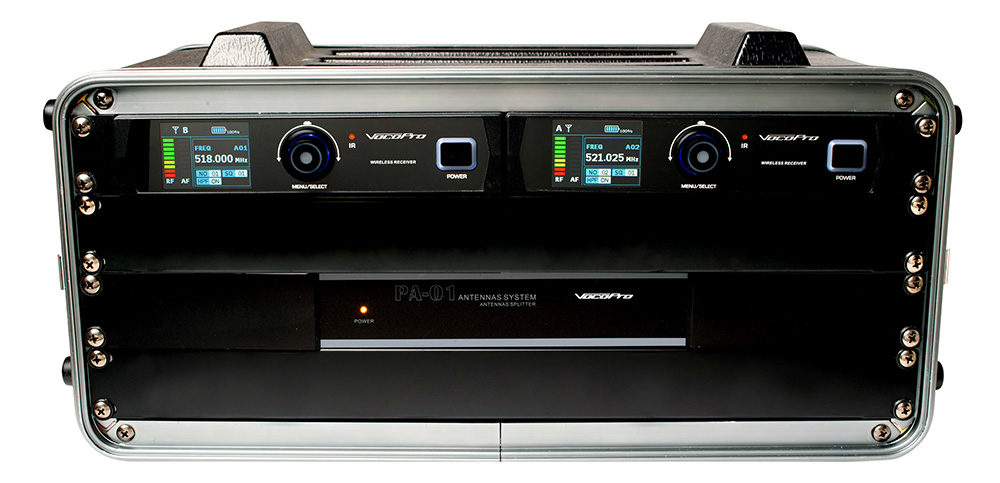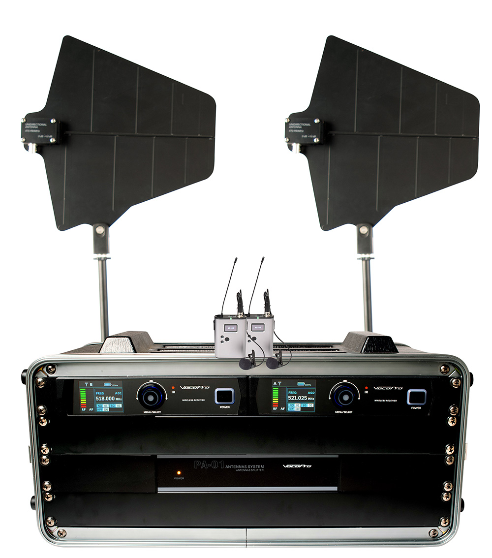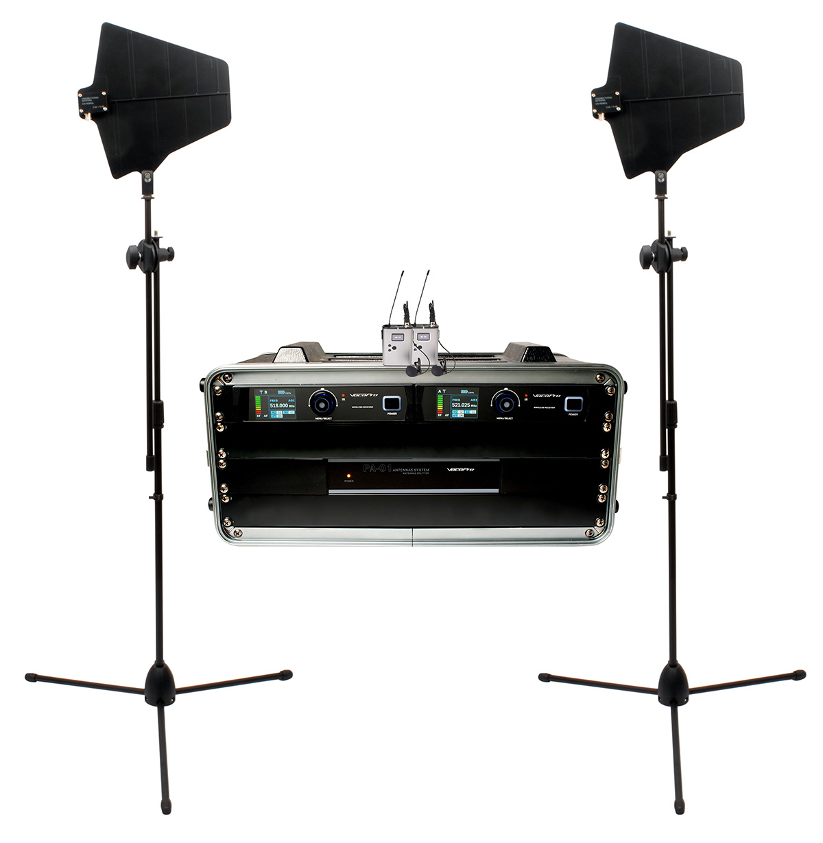 The system consists of true diversity receivers, handheld microphone or body pack transmitter, antenna distribution system and two active directional antennas. Packaged in a flight case and including floor stands for the antennas.