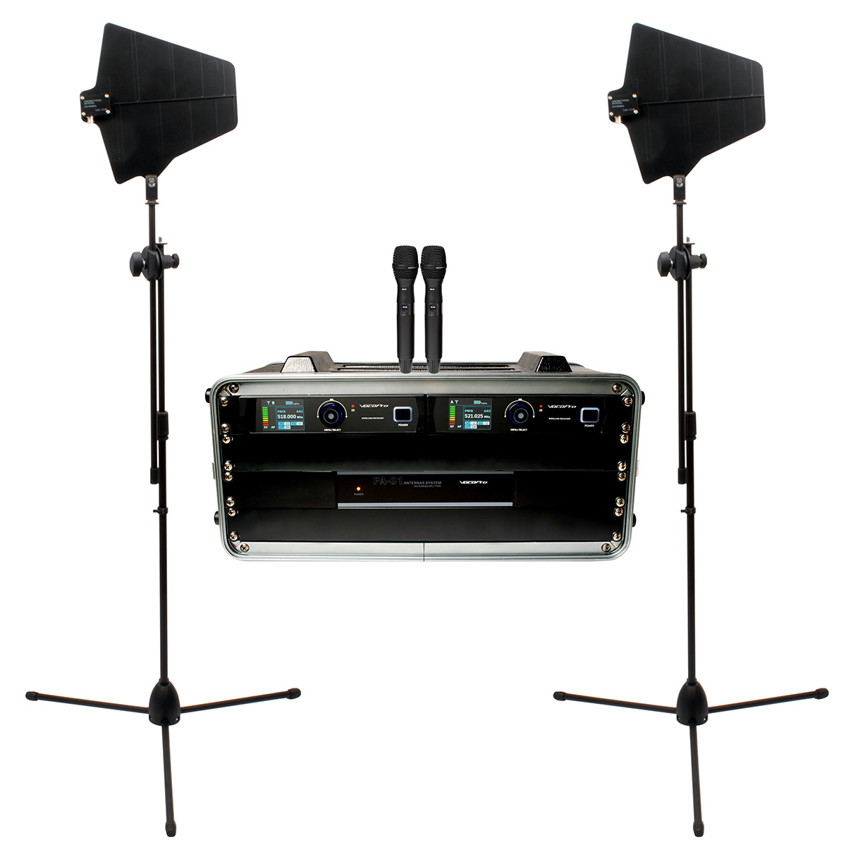 The system consists of true diversity receivers, handheld microphone or body pack transmitter, antenna distribution system and two active directional antennas. Packaged in a flight case and including floor stands for the antennas.