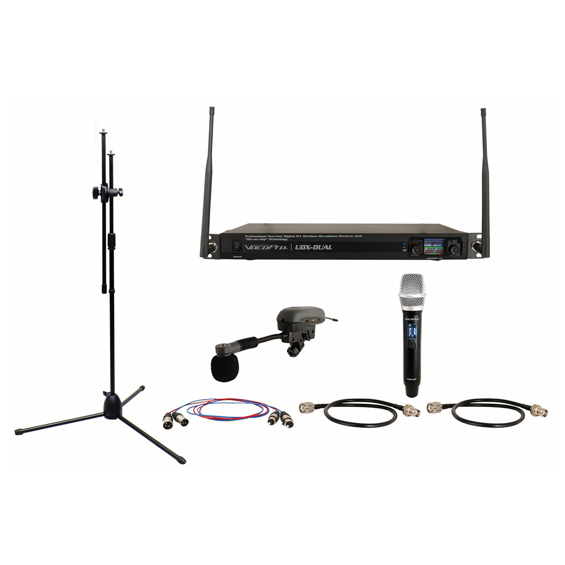 Included: 1x UDX-DUAL digital PLL mic receiver 1x UDX-IT instrument microphone for drums or brass & woodwind instruments 1x UDX-HT handheld wireless vocal microphone 1x BM-36 boom microphone stand 2x 6' XLR balanced cables