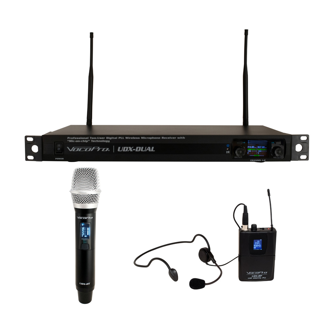 Includes: UDX-DUAL two-channel receiver UDX-HT handheld microphone UDX-BP headset microphone with bodypack transmitter 2x XLR-6FT audio cable