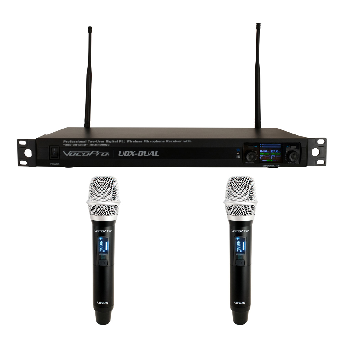 VocoPro's new UDX-DUAL-HANDHELD is a professional two-person digital PLL wireless microphone system designed for DJ, karaoke bars, houses of worship, and schools. Featuring cutting-edge "Mic-on-Chip"™ technology, this system delivers crystal-clear vocals and reliable performance at an unbeatable value.