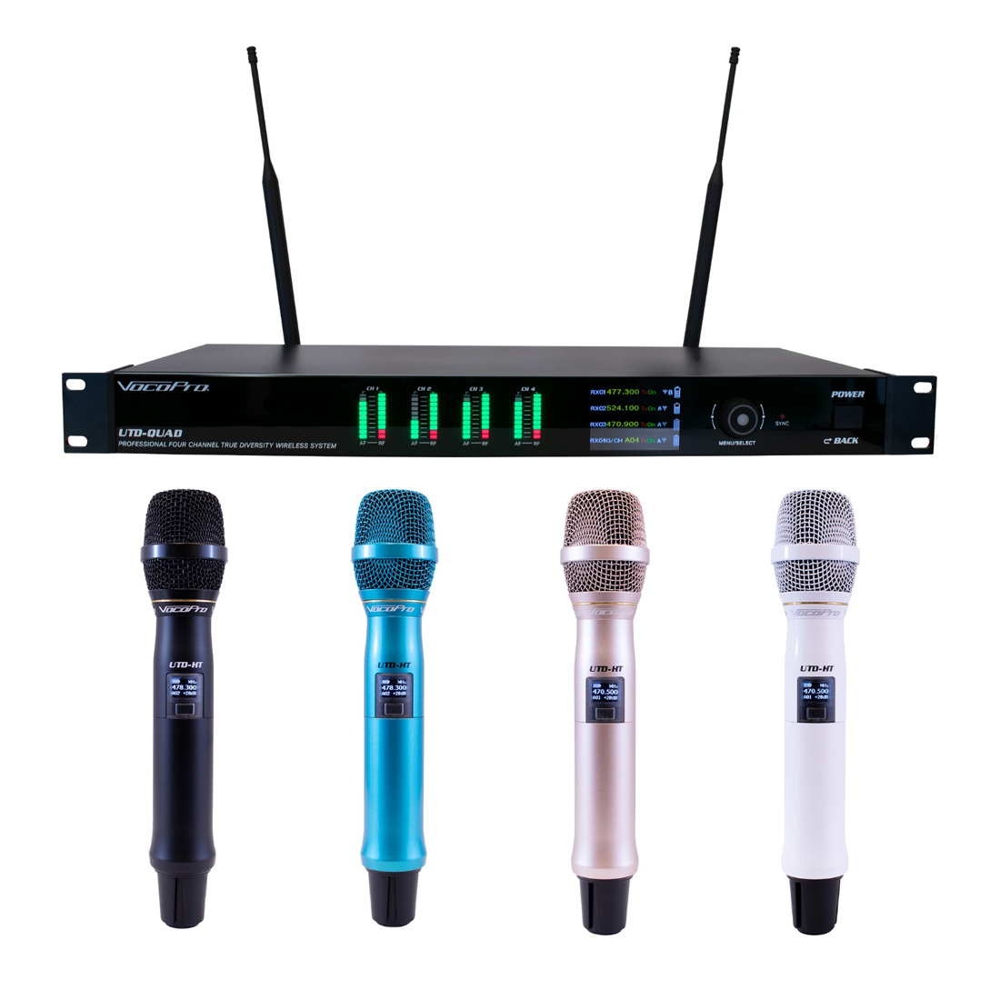 The UTD-QUAD receiver can be paired with three different transmitters: The metal-body handheld microphone which is available in four different colors, the metal-body bodypack transmitter with included low-profile beige headset mic, and the conference/podium mic with built-in long-lasting rechargeable battery.