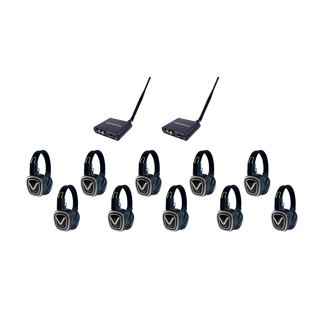 Professional Long-Range Silent Disco/ Event package with Two Transmitters and Ten Headphone Receivers